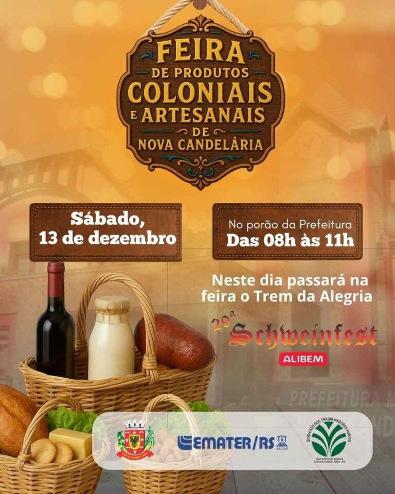 Nova Candelária realiza Feira de Produtos Coloniais e Artesanais neste sábado com participação do Trem da Alegria da 29ª Schweinfest Leia mais... 13/12/2025