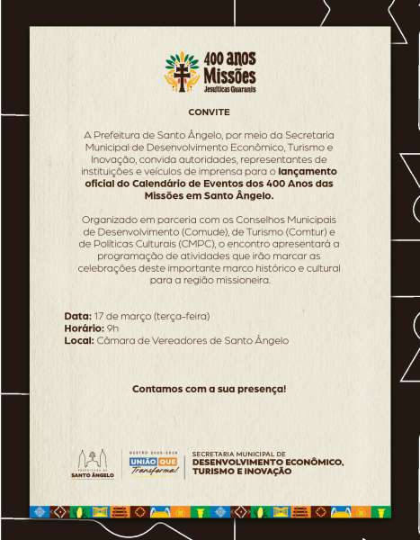 Santo Ângelo apresenta calendário oficial dos 400 anos das Missões nesta terça-feira Leia mais... 16/03/2026