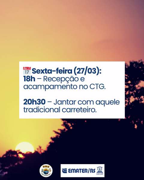 A cavalgada terá início na sexta-feira (27), com a recepção dos participantes e acampamento no CTG Recanto da Tradição, a partir das 18h.