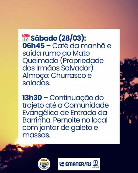 No sábado (28), as atividades começam cedo. Às 6h45, será servido o café da manhã, seguido da saída da cavalgada rumo a Mato Queimado, com destino à propriedade dos Irmãos Salvador.