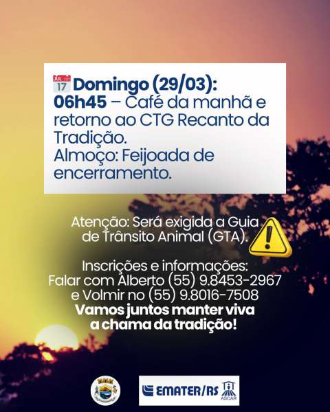 A organização destaca que será obrigatória a apresentação da Guia de Trânsito Animal (GTA) para participação na cavalgada, medida importante para garantir a regularidade sanitária e a segurança do evento.