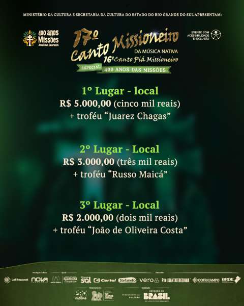 Já o Canto Piá Missioneiro, voltado às categorias mirim e juvenil, busca estimular novos talentos da música regional. Os prêmios incluem R$ 700 para o 1º lugar, R$ 500 para o 2º lugar e R$ 300 para o 3º lugar, todos acompanhados de troféu.