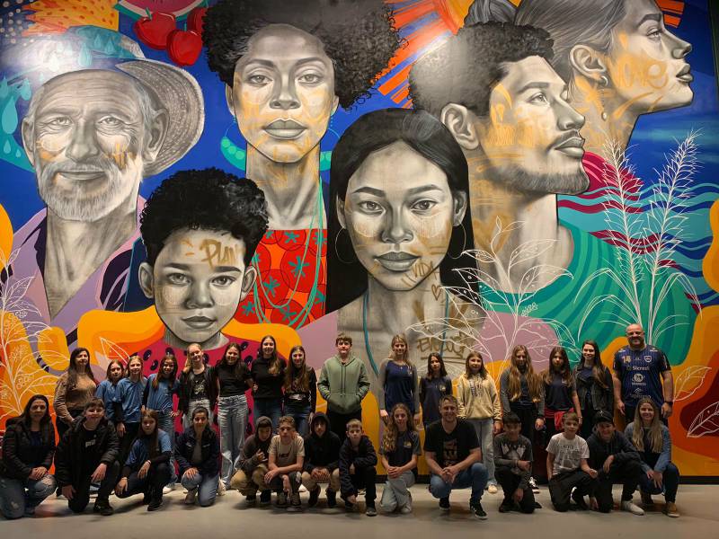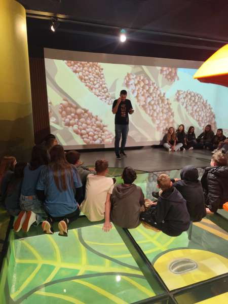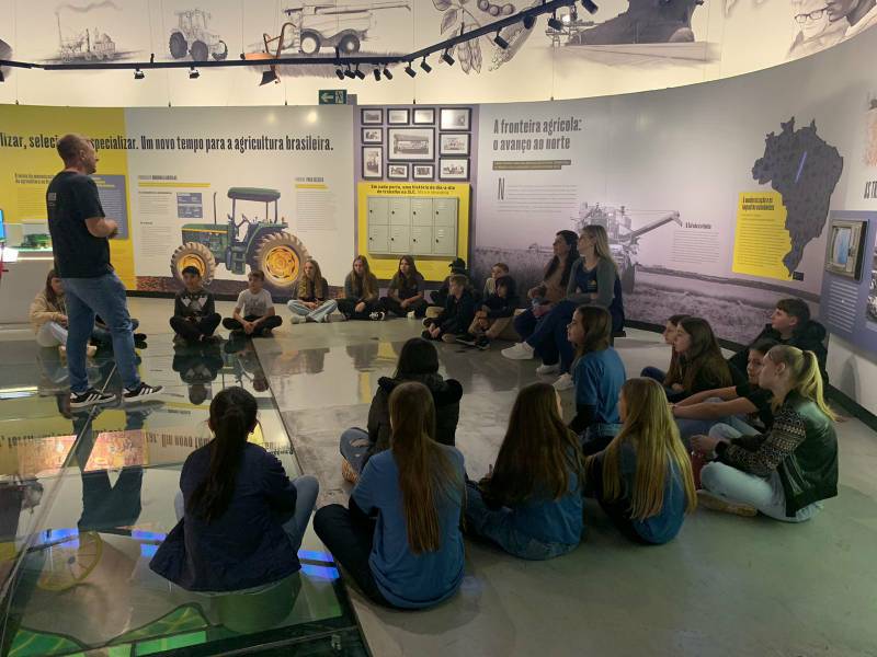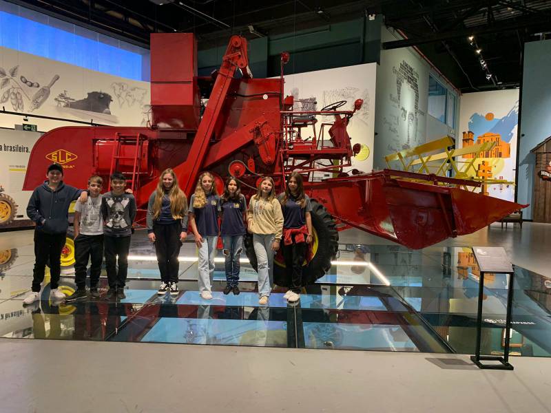 A visita começou no “Palco da Evolução Agrícola”, ambiente que se movimenta conforme a narrativa é apresentada em vídeos, sons, fotografias, gráficos e projeções em vídeo mapping. Em seguida, os alunos percorreram salas com cenografias detalhadas, painéis explicativos, equipamentos de época, displays com grãos, ferramentas e maquinário agrícola do passado e do presente.