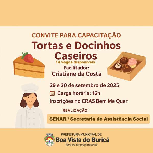 A Secretaria Municipal de Assistência Social de Boa Vista do Buricá, em parceria com o Senar, está com inscrições abertas para a capacitação em tortas e docinhos caseiros. A atividade acontecerá nos dias 29 e 30 de setembro de 2025, com carga horária total de 16 horas.