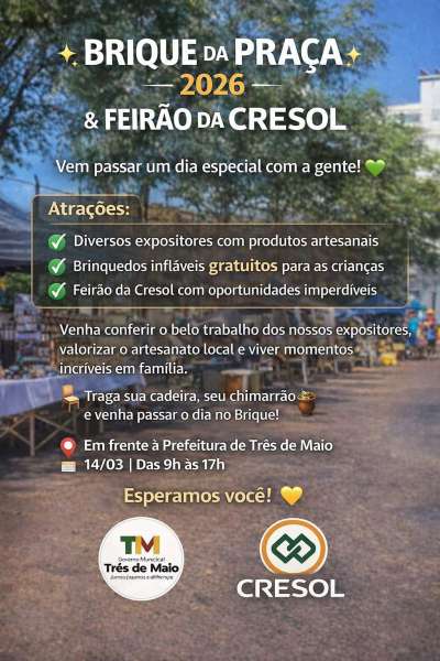 A comunidade de Três de Maio terá um domingo especial de convivência, lazer e valorização do empreendedorismo local com a realização do Brique da Praça 2026 & Feirão da Cresol, marcado para o dia 14 de março, das 9h às 17h, em frente à Prefeitura de Três de Maio.