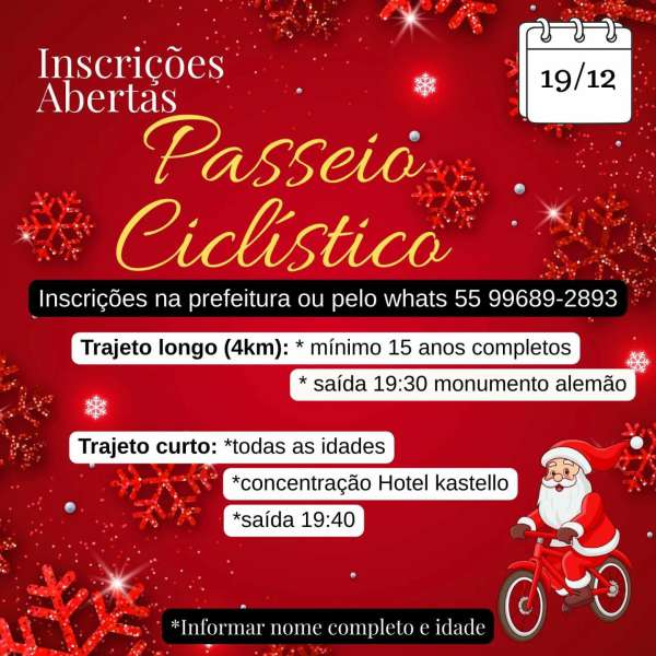 A Prefeitura de Campina das Missões abriu as inscrições para o Passeio Ciclístico da A Magia do Natal, atividade que integra a programação natalina do município e promete reunir ciclistas de todas as idades em um momento de lazer, movimento e celebração comunitária. O evento ocorre no dia 19 de dezembro.