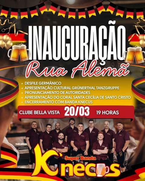 A programação inclui desfile temático germânico, apresentação do grupo de dança Grünerthal Tanzgruppe, além de pronunciamentos de autoridades locais. Também está prevista a participação do Coral Santa Cecília de Santo Cristo e, no encerramento, show com a Super Banda Knecus.