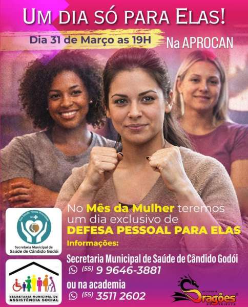 O município de Cândido Godói promove nesta terça-feira, 31 de março, uma programação especial voltada ao público feminino, com uma noite exclusiva de defesa pessoal para mulheres. A atividade será realizada às 19h, na APROCAN.