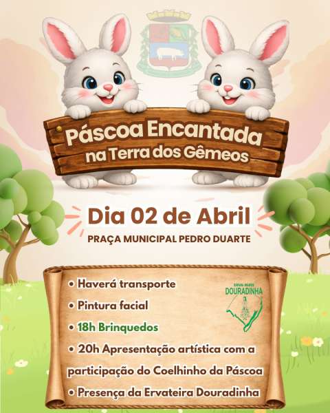 O município de Cândido Godói realiza na quinta-feira, 2 de abril, a programação especial Páscoa Encantada na Terra dos Gêmeos, com atividades voltadas às famílias e ao público infantil na Praça Municipal Pedro Duarte.