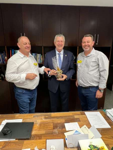 Durante a visita ao gabinete do Senador Luis Antônio Heinze, os representantes receberam a confirmação do direcionamento de uma emenda de comissão destinada à aquisição de uma retroescavadeira para o setor da agricultura.