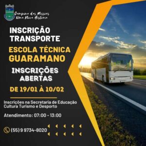 Estão abertas as inscrições para estudantes que necessitam de transporte escolar para fins de estudo na Escola Técnica Guaramano, localizada em Guarani das Missões. Os interessados devem realizar a inscrição…