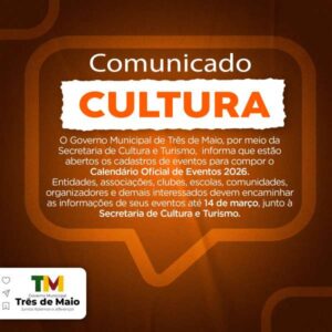 O Governo Municipal de Três de Maio, por meio da Secretaria de Cultura e Turismo, informa que estão abertos os cadastros de eventos que irão compor o Calendário Oficial de…