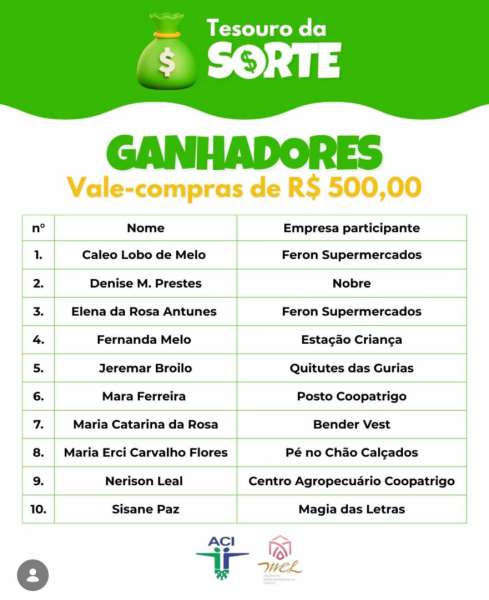 A Associação Comercial e Industrial de São Luiz Gonzaga, juntamente com e MEL, Mulheres Empreendedoras Líderes, realizaram ontem o primeiro sorteio da Promoção Tesouro da Sorte, a qual está sendo realizada com o objetivo de incentivar as compras no comércio são-luizense e os clientes da Coopatrigo foram o grande destaque do sorteio, sendo que dos 15 prêmios sorteados, 7 contemplaram clientes do Varejo Coopatrigo.