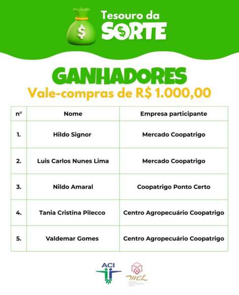 A Coopatrigo, através dos responsáveis por cada um dos setores que tiveram clientes premiados, parabeniza os contemplados e agradece a preferência dos clientes por comprarem no Varejo Coopatrigo e que continuem apostando na sorte porque a Promoção Tesouro da Sorte continua durante o mês de janeiro e terá uma segunda rodada de sorteio no início do mês de fevereiro.