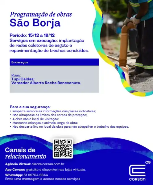 As frentes de trabalho estarão devidamente sinalizadas antes, durante e após a execução dos serviços. Para esclarecer dúvidas da população e orientar sobre os próximos passos após a instalação da rede, equipes do setor de Responsabilidade Social da Corsan estarão presentes nos locais de obra. A comunidade também pode contatar a equipe local pelo telefone (55) 99208-5075.