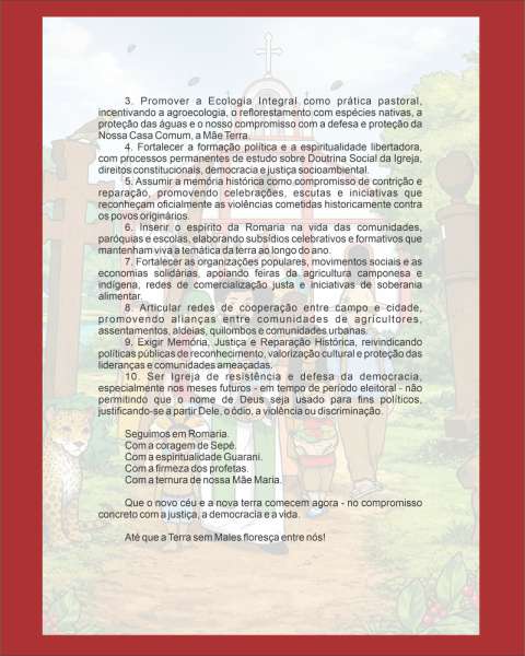 A Romaria é definida como gesto político e eclesial, expressão de uma fé inseparável da luta por direitos. O texto afirma o compromisso de uma Igreja samaritana, próxima dos pobres, dos povos originários, das comunidades quilombolas e dos trabalhadores do campo e da cidade.
