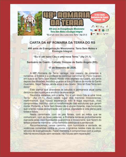 A Carta da 48ª Romaria da Terra do Rio Grande do Sul, divulgada no Santuário do Caaró, em Caibaté, sintetiza o espírito do encontro realizado dentro das celebrações dos 400 anos da Evangelização Missioneira. Inspirada no tema “Terra Sem Males e Ecologia Integral” e no lema bíblico “Eu vi um novo Céu e uma nova Terra” (Ap 21,1), a carta une memória histórica, denúncia profética e compromissos concretos.