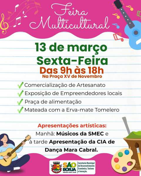 A comunidade de São Borja terá uma programação especial nesta sexta-feira, 13 de março, com a realização da Feira Multicultural de São Borja, que promete reunir cultura, arte e empreendedorismo local no coração da cidade.