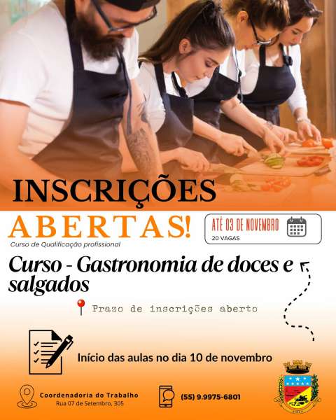O Governo Municipal de Giruá, por meio da Coordenadoria de Trabalho e Cidadania, anunciou a abertura das inscrições para o curso gratuito de Qualificação Profissional em Gastronomia de Doces e Salgados. A iniciativa tem como objetivo oferecer formação prática e teórica a moradores do município interessados em atuar ou aprimorar seus conhecimentos na área da gastronomia.