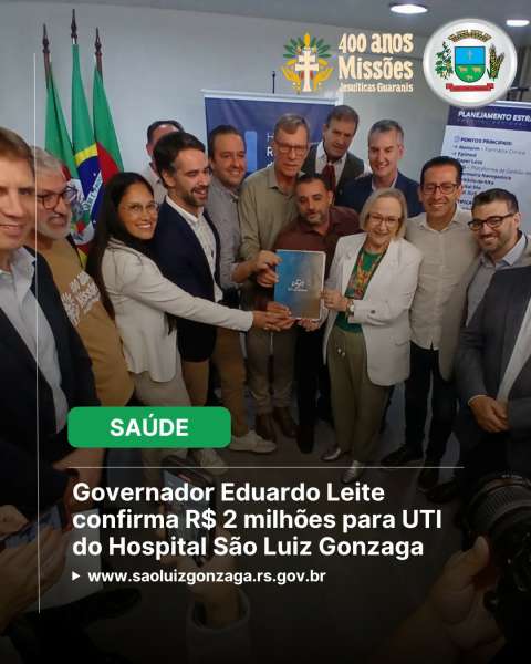 O governador do Rio Grande do Sul, Eduardo Leite, anunciou nesta terça-feira (24) o repasse de R$ 2 milhões para a aquisição de equipamentos destinados à Unidade de Terapia Intensiva (UTI) do Hospital São Luiz Gonzaga.