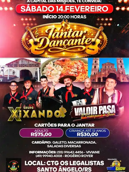 O CTG Os Legalistas, em Santo Ângelo (RS), promove no sábado, 14 de fevereiro de 2026, o tradicional Jantar Dançante, evento que une gastronomia regional, música ao vivo e convivência comunitária em ambiente típico do tradicionalismo gaúcho.