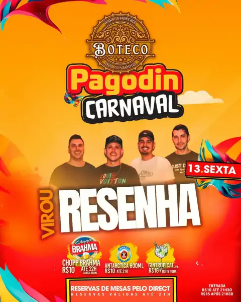 O município de Santo Ângelo (RS) terá mais uma opção de entretenimento nesta sexta-feira, 13 de fevereiro de 2026, com o Pagodin Carnaval – Virou Resenha, evento que aposta no clima descontraído de boteco aliado ao ritmo do pagode para animar a noite de Carnaval.