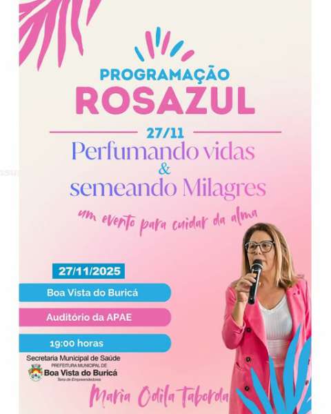 A Secretaria Municipal de Saúde de Boa Vista do Buricá promove, no dia 27 de novembro de 2025, uma palestra especial dentro da programação RosAzul, iniciativa voltada à promoção da saúde integral e ao bem-estar da comunidade. O encontro será conduzido por Maria Odila Taborda, que abordará reflexões sobre motivação, autocuidado, fé e saúde emocional, com o tema “Perfumando Vidas & Semeando Milagres”.