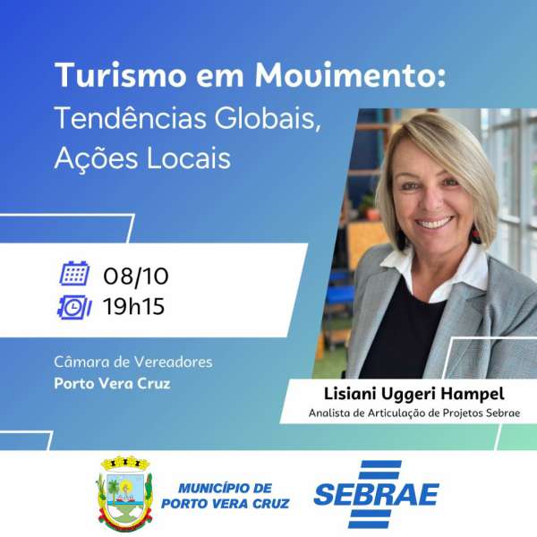 A Prefeitura de Porto Vera Cruz, em parceria com o Sebrae-RS, realizará na próxima quarta-feira, 8 de outubro, uma palestra especial sobre o futuro do turismo, com o tema “Turismo em Movimento: Tendências Globais, Ações Locais”. O evento acontecerá na Câmara Municipal de Vereadores, com início às 19h15min.