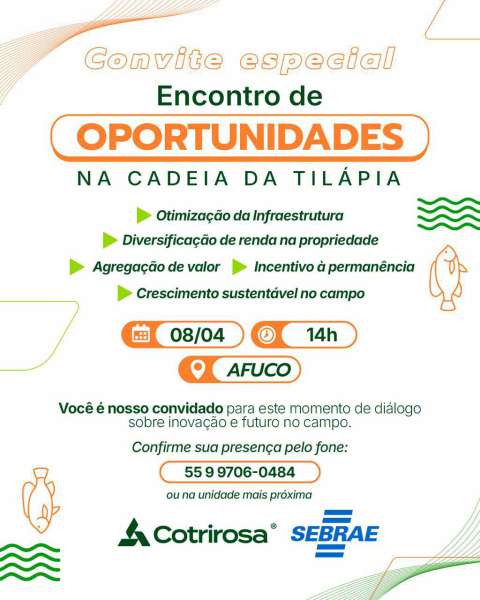 A Prefeitura de Campina das Missões realiza no próximo dia 8 de abril, às 14 horas, um encontro voltado ao fortalecimento do setor rural, com destaque para as oportunidades na produção de tilápia e estratégias de desenvolvimento no campo.