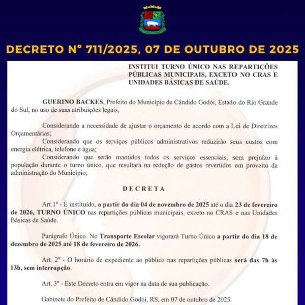 A Prefeitura de Cândido Godói publicou o Decreto nº 711/2025, de 7 de outubro, estabelecendo turno único de atendimento nas repartições públicas municipais entre os dias 4 de novembro de 2025 e 23 de fevereiro de 2026.