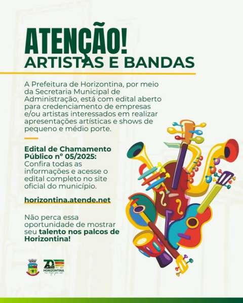 A Prefeitura Municipal de Horizontina, por meio da Secretaria de Administração, lançou o Edital de Chamamento Público nº 05/2025, voltado ao credenciamento de artistas, bandas e empresas do setor cultural interessadas em realizar apresentações artísticas e shows de pequeno e médio porte.