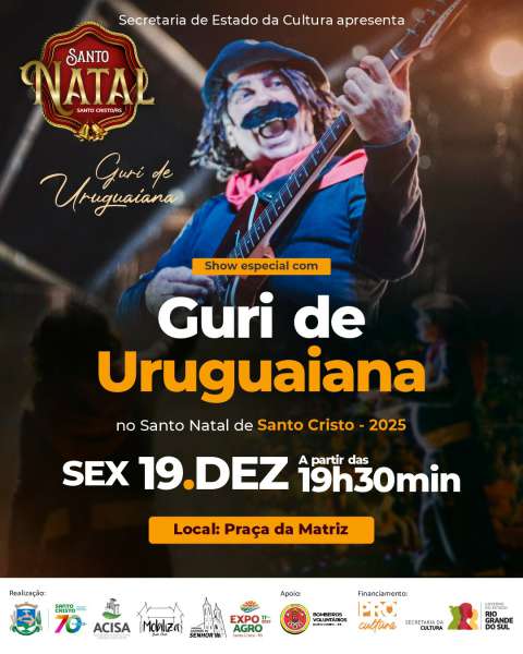 O Santo Natal 2025 é uma realização do Município de Santo Cristo, da ACISA, do Grupo Mobiliza, da Paróquia Ascensão do Senhor e da EXPOAGRO, com apoio dos Bombeiros Voluntários de Santo Cristo. O evento conta com financiamento do Pró-Cultura, da Secretaria da Cultura e do Governo do Estado do Rio Grande do Sul.