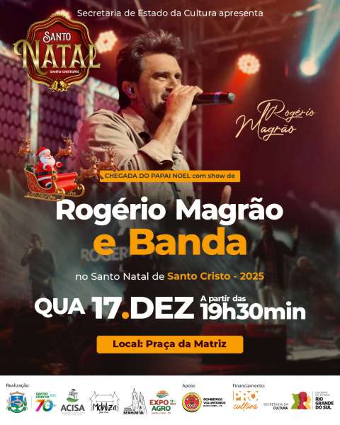 A abertura acontece no dia 17 de dezembro, a partir das 19h30, com show de Rogério Magrão e Banda, marcando também a aguardada chegada do Papai Noel. No dia 19, às 19h30, o palco recebe o humorista Guri de Uruguaiana, levando diversão e tradição gaúcha ao público.