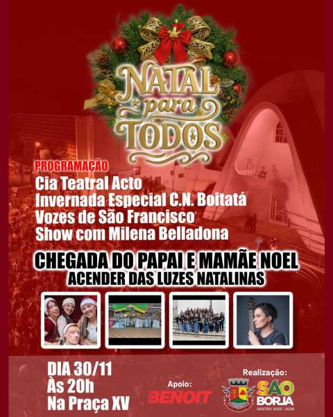A magia do Natal está prestes a tomar conta de São Borja. No dia 30 de novembro, a partir das 20h, a Praça XV será palco do evento “Natal para Todos”, que abre oficialmente a temporada natalina no município com uma programação repleta de encanto, cultura e emoção.