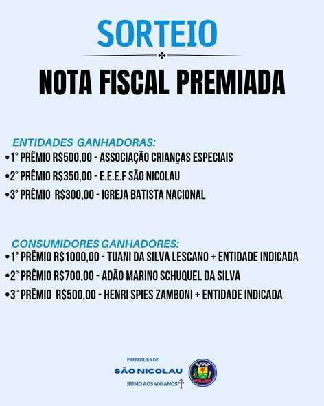 A Prefeitura de São Nicolau divulgou o resultado do sorteio do programa Nota Fiscal Premiada, realizado no dia 23 de dezembro, contemplando consumidores e entidades do município. A iniciativa tem como objetivo incentivar a solicitação de notas fiscais no comércio local e fortalecer as instituições da comunidade.