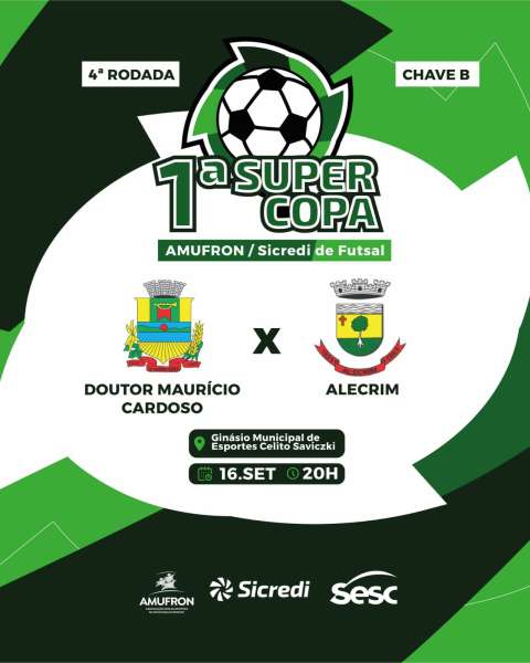 Na próxima terça-feira, 16 de setembro, a partir das 20h, o Ginásio Municipal de Esportes Celito Savizcki, em Doutor Maurício Cardoso, será o palco da 4ª rodada da Super Copa AMUFRON de Futsal, competição promovida pela Associação dos Municípios da Fronteira Noroeste (AMUFRON).