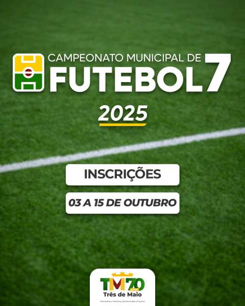 O Campeonato Municipal de Futebol 7 de Três de Maio 2025 está com inscrições abertas entre os dias 3 e 15 de outubro. A competição promete movimentar o esporte local e contará com disputas em quatro categorias: Sub-10, Sub-12, Livre Masculino e Veterano Masculino.