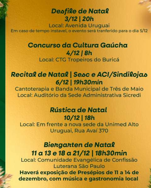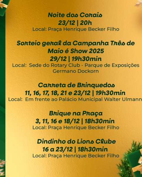 Três de Maio se prepara para um dezembro movimentado, com iniciativas que buscam valorizar a cultura local e oferecer momentos de confraternização para moradores e visitantes.