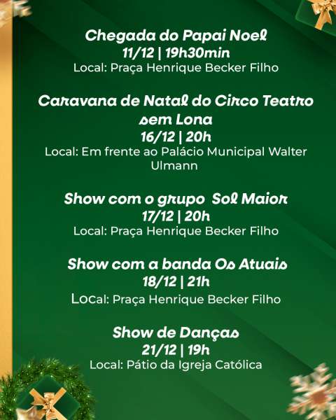 Entre os destaques estão a chegada do Papai Noel, shows artísticos, Biergarten, Brique e diversas atividades distribuídas ao longo do mês, todas organizadas para proporcionar experiências de convivência e fortalecer o espírito natalino no município.
