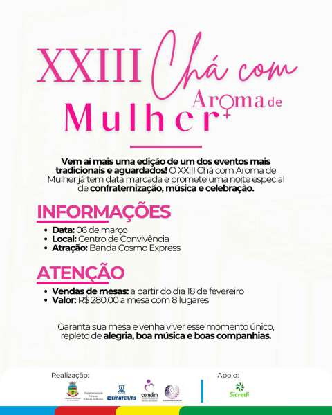 Já está confirmada a realização do XXIII Chá com Aroma de Mulher, um dos eventos sociais mais tradicionais e aguardados da comunidade, que promete reunir público em uma noite marcada por integração, música e celebração. A programação acontece no dia 6 de março, no Centro de Convivência.