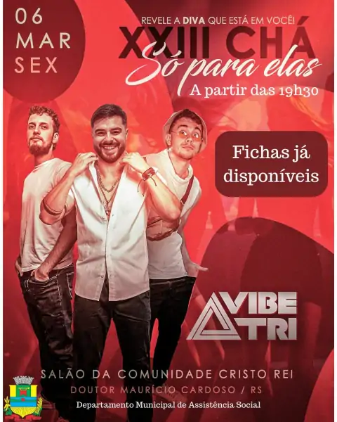 A Administração Municipal de Doutor Maurício Cardoso (RS) promoverá no dia 6 de março de 2026 a 23ª edição do Chá Só Para Elas, evento tradicional alusivo ao Dia Internacional da Mulher. A programação será realizada no Salão da Comunidade Católica Cristo Rei, com início previsto para as 19h30.